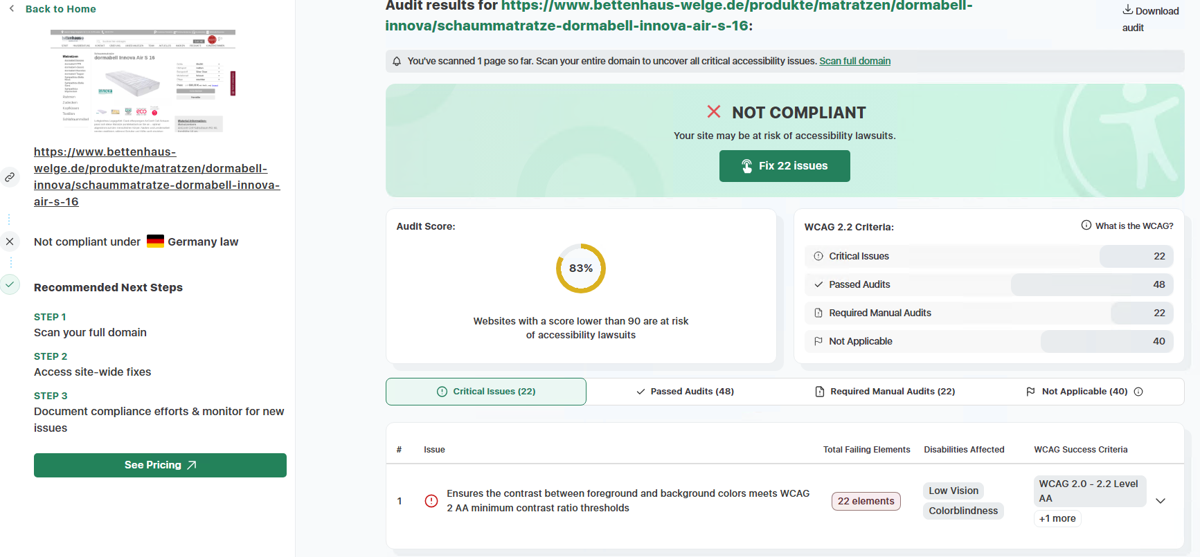 Zur Veranschaulichung unserer kontinuierlichen Überprüfungen der Barrierefreiheit haben wir Ergebnisse aus dem etablierten Tool accessibilitychecker.org dokumentiert. Diese Screenshots illustrieren exemplarisch identifizierte Barrieren sowie die erzielten Fortschritte. Im Folgenden finden Sie drei ausgewählte Screenshots solcher Prüfungen: